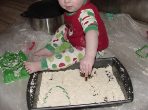 Jelly Bean also thoroughly enjoyed “making it snow.” She snowed all over her feet, then my legs, the bowl, the dogs, and anything else that needed a little frosting (great sensory activity). Thank goodness for that plastic sheeting!