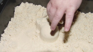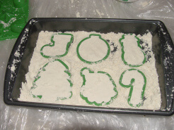 I also introduced some cookie cutters, Jello Jiggler molds, and a bowl (this one on accident) into the mix. My items were centered around Christmas, but you could use almost anything. For example, I envision an indoor sand castle contest in the future when it is too cold, and the kids are missing summer!